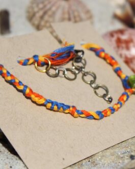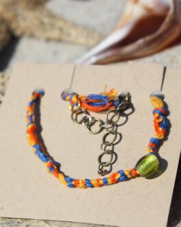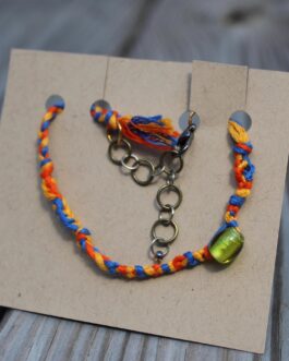 • Macramé Friendship Bracelet Handmade Adjustable Length Lobster Clasp Orange & Blue Salvaged Cotton Embroidery Floss w/ Lampworked Glass Bead