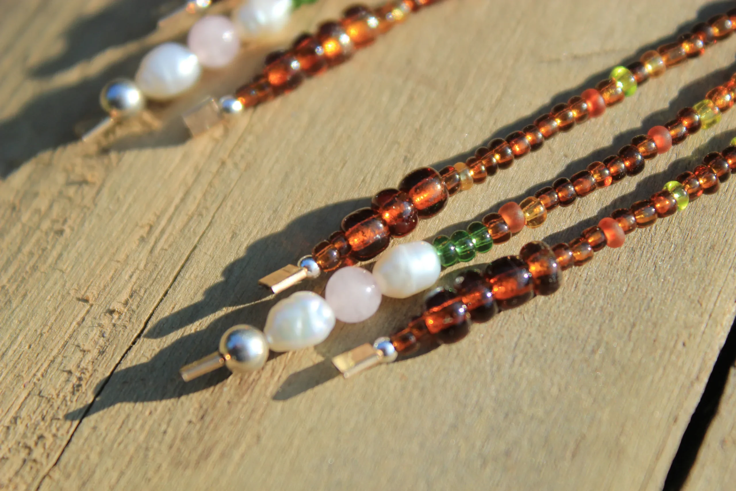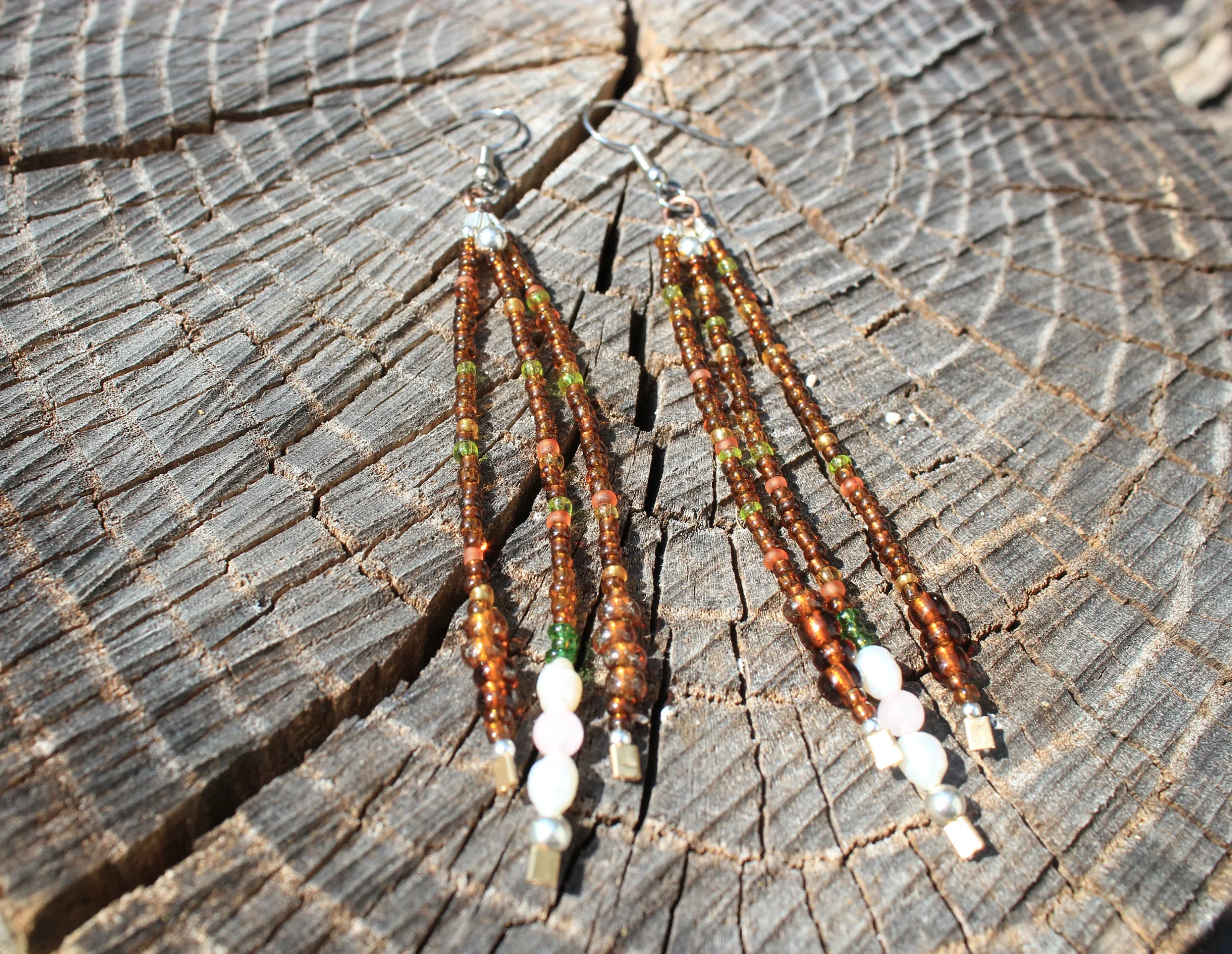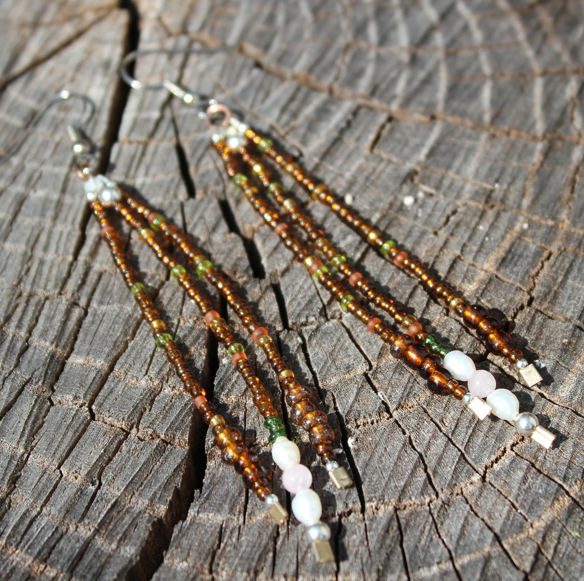 Handmade Long Shoulder Duster Autumn Earrings Silver, Freshwater Pearl, Rose Quartz, and Glass Seed Bead One of a Kind Beaded Jewelry