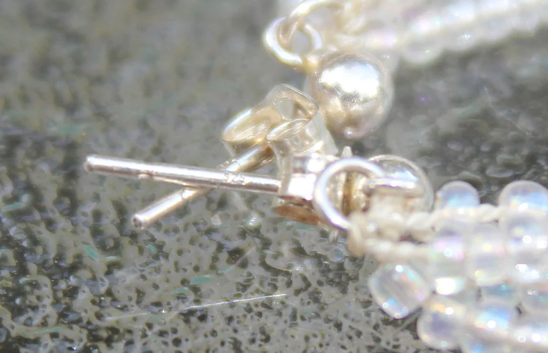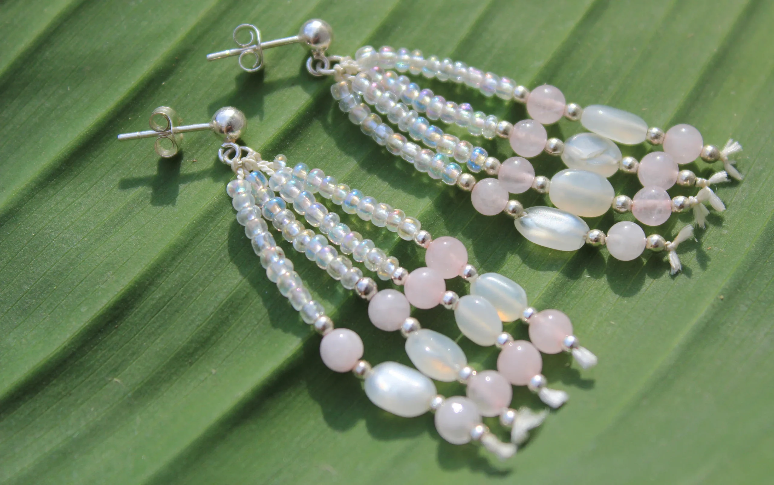 Moonstone, Rose Quartz Gemstone, Sterling Silver, and Iridescent White Glass Seed Bead Beaded 925 Sterling Silver Stud Dangle Earrings