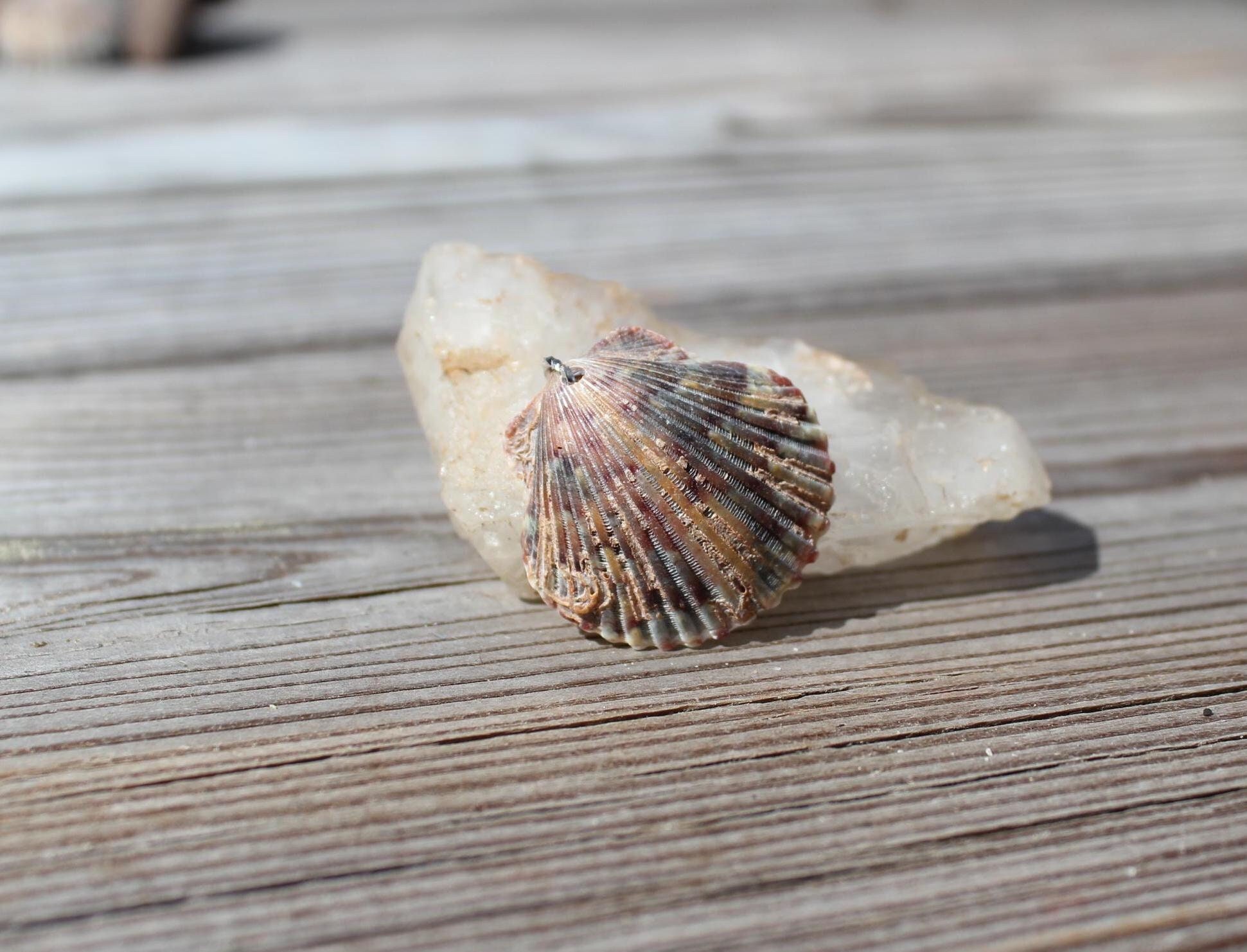 Looking for natural, ethically sourced, and one-of-a-kind jewelry making supplies? This natural scallop shell was hand collected from the beaches of North Carolina. Each shell is carefully drilled by hand with a rotary drill and placed on a decorative stainless steel jump ring.